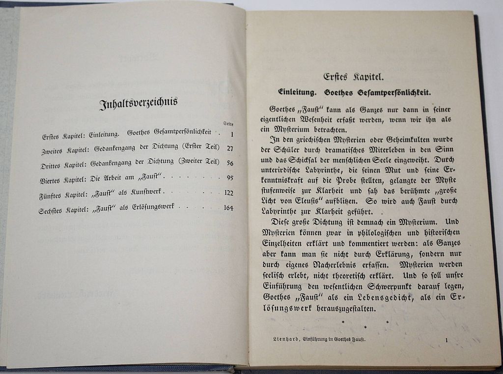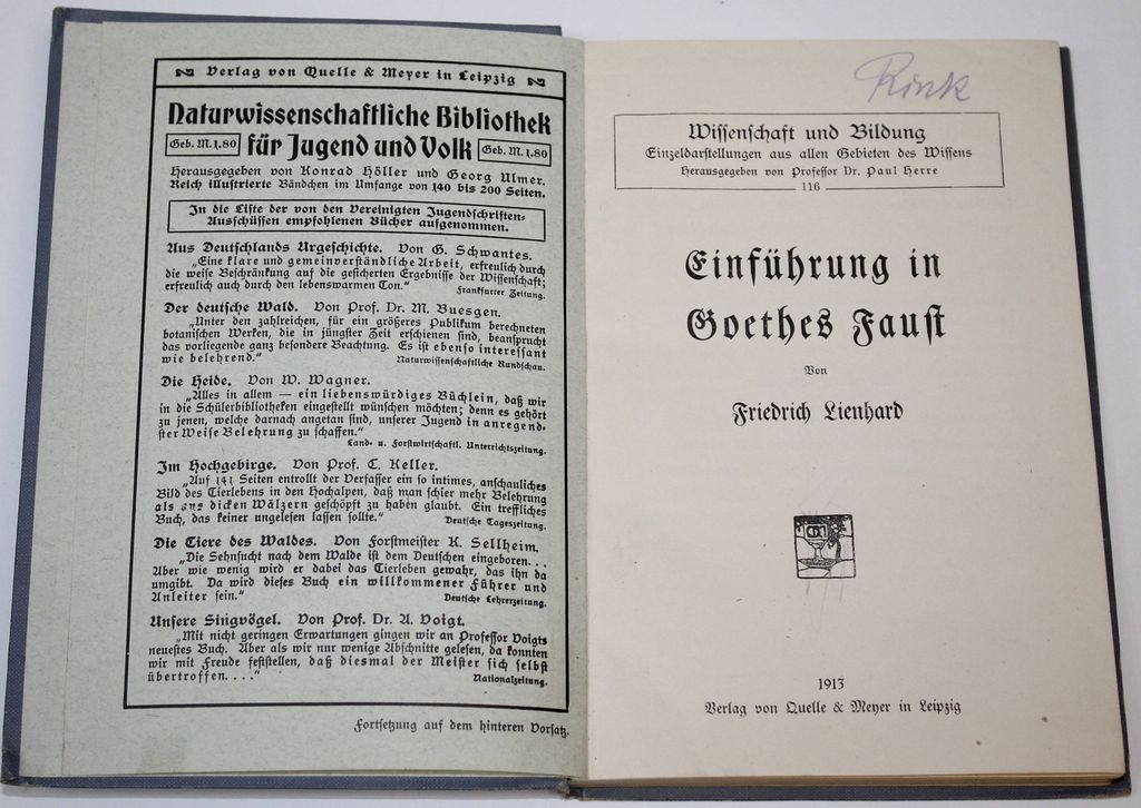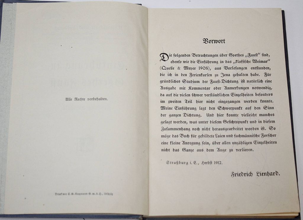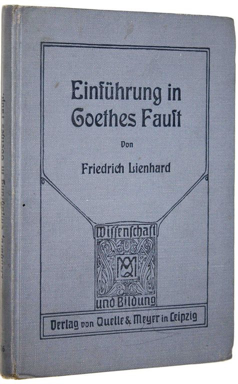 Линхард Ф. Введение к `Фаусту` Гете. [Lienhard F. Einfuhrund in Goethes Faust. На нем. яз.]. Leipzig: Verlag von Quelle&Meyer, 1913. – [4], 170, [34] с. Твердый издательский переплет. Обычный формат, 19х13 см. Фридрих Линхард (1865–1929) — немецкий писатель. Хорошее состояние. Оборван фрагмент одного листа.