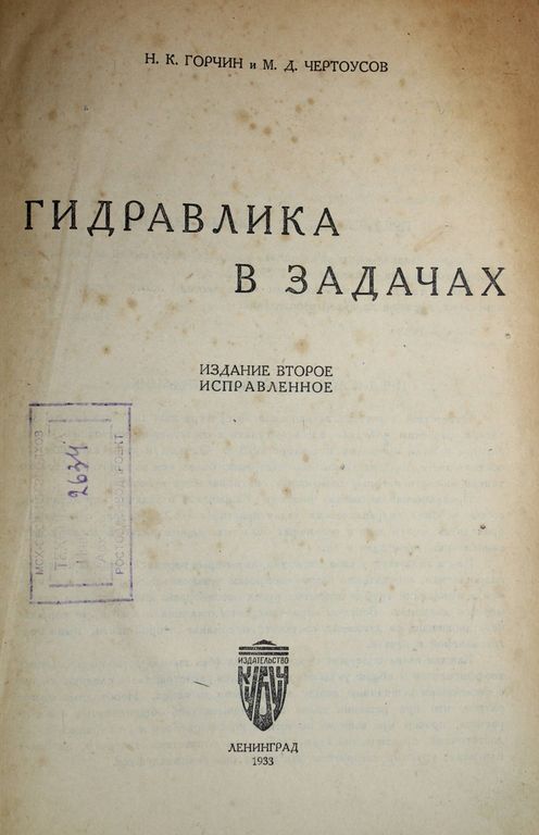 Горчин Н.К., Чертоусов М.Д. Гидравлика в задачах. Издание второе исправленное. Л.: Изд. `Кубуч`, 1933. – 364 с., ил., 5 ил. табл. Твердый переплет с потухшим золотым тиснением. Энциклопедический формат, 26х18 см. Сборник задач практического характера, в различных областях гидротехники: водоснабжение, канализация, ирригация и др. Удовлетворительное состояние. Старый библ. штамп на тит. листе.