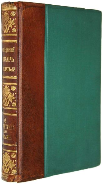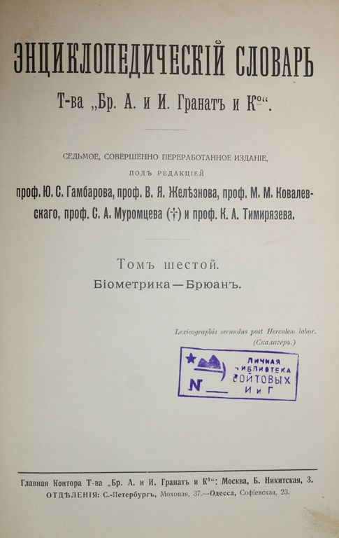 Энциклопедический словарь Т-ва `Бр. А. и И. Гранат и К `. Том 6: Биометрика - Брюант. 7-е совершенно переработанное издание под редакцией проф. В.Я.Железнова, М.М.Ковалевского, С.А.Муромцева и К.А.Тимирязева. М.: Изд-во `Бр. А. и И. Гранат и К`, [1911]. – [8], 640 стлб., XII с.,ил., 29 л. ил., табл. В издательском полукожаном переплете с золотым тиснением. Защитные кальки. Энциклопедический формат, 24х17 см. Энциклопедический словарь Гранат - одна из крупнейших русских универсальных энциклопедий. Первые 6 изданий словаря вышли в 8-9 тт. (1891—1903). 7-е издание словаря, полностью переработанное, было выпущено в 1910—1948 под названием `Энциклопедический словарь Гранат`, в 58 тт. и 1 доп. томе. Очень хорошее состояние. Золото горит. Небольшая потертость переплета, утрата 1 л. илл. Владельческие экслибрисы.