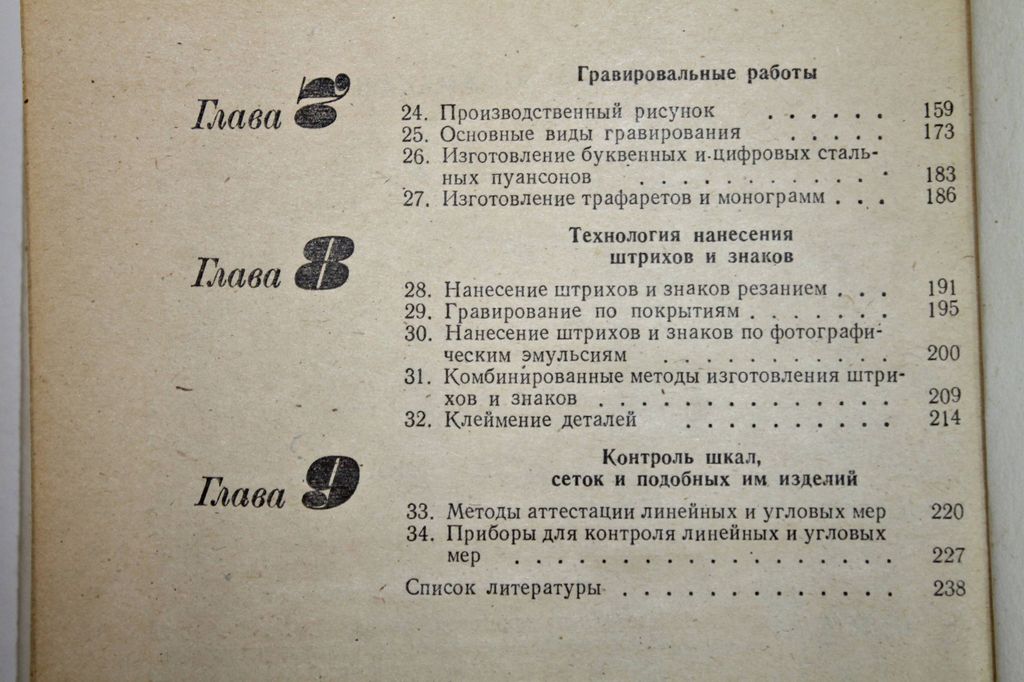 Федотов А. И., Улановский О. О. Граверное дело. Учебник для профтехучилищ. Л.: Машиностроение. 1981г. 240 с., ил. Большое внимание в пособии уделено проблемам механизации и автоматизации граверных работ. Рассматриваются устройство и работа основных узлов оборудования, приемы настройки и правила их эксплуатации. Дано описание различного рода приспособлений, которые существенно расширяют технологические возможности граверного оборудования. Содержание: Организация граверно-делительного участка. Инструменты и приспособления. Материалы заготовок. Копировальные устройства, копиры и шаблоны. Универсальные приспособления. Оборудование для делительно-граверных работ. Гравировальные работы. Технология нанесения штрихов и знаков. Контроль шкал, сеток и подобных им изделий. Твердый переплет. Увеличенный формат. Хорошее состояние.