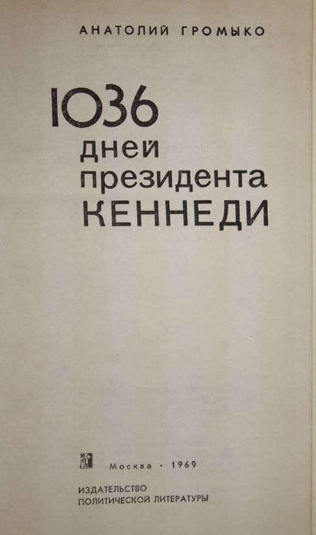 Громыко А.А. 1036 дней президента Кеннеди. Серия: Запад наших дней. М.: Политиздат. 1969г. 279с. Книга посвящена внешней политике правительства Кеннеди; вместе с тем автор рисует картину сложной и противоречивой политической жизни Америки 60-х годов, показывает, как и кем формируется внешнеполитический курс США, анализирует причины роста агрессивности и авантюризма. Твердый переплет. Суперобложка. Обычный формат. Хорошее состояние.