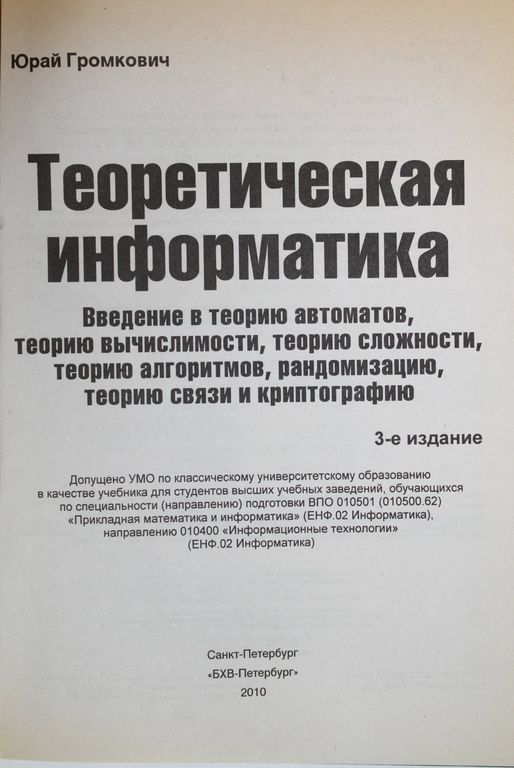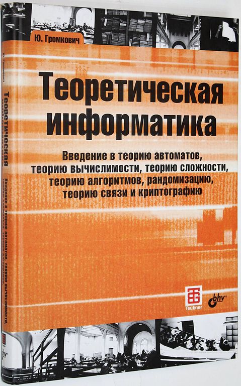 Громкович Ю. Теоретическая информатика. Введение в теорию автоматов, теорию вычислимости, теорию сложности, теорию алгоритмов, рандомизацию, теорию связи и криптографию. СПб.: БХВ-Петербург. 2010г. 336с. В книге изложены основные понятия теоретической информатики: алфавиты, слова, языки, алгоритмические проблемы, конечные автоматы, машины Тьюринга. Рассматриваются теория вычислимости, теория сложности, алгоритмизация труднорешаемых задач, рандомизация, теория связи и криптографические методы. Книга известного ученого вышла на 4-х языках (немецкий, английский, французский, японский), в ближайшее время планируется издание еще на 3-х языках. На русском языке издается впервые. Твердый переплет. Увеличенный формат. Отличное состояние.