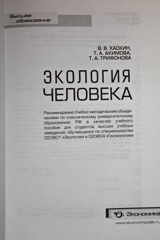 Хаскин В.,Акимова Т. Экология человека. Учебное пособие. М.: Экономика. 2008г. 367 с. `В учебном пособии раскрываются основные проблемы экологии человека — науки, в рамках которой изучаются закономерности и особенности взаимодействия человека и человеческих общностей с окружающей природной и социальной средой. Системно излагаются предмет, задачи и методы, основные исторические периоды и экологические особенности антропогенеза. Твердый переплет. Увеличенный формат. Отличное состояние.