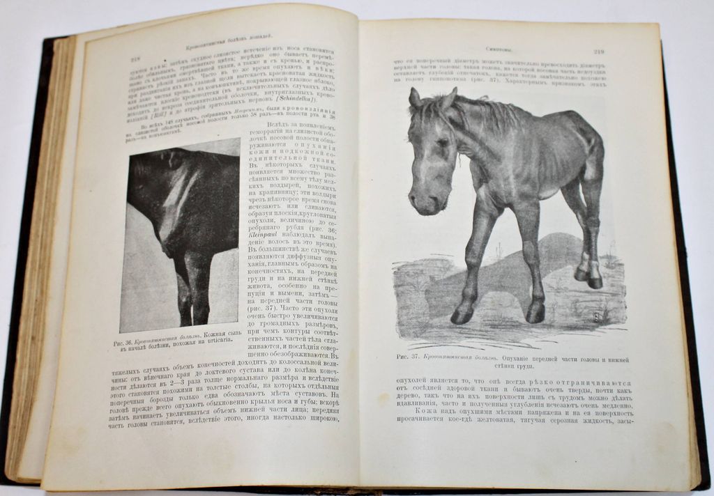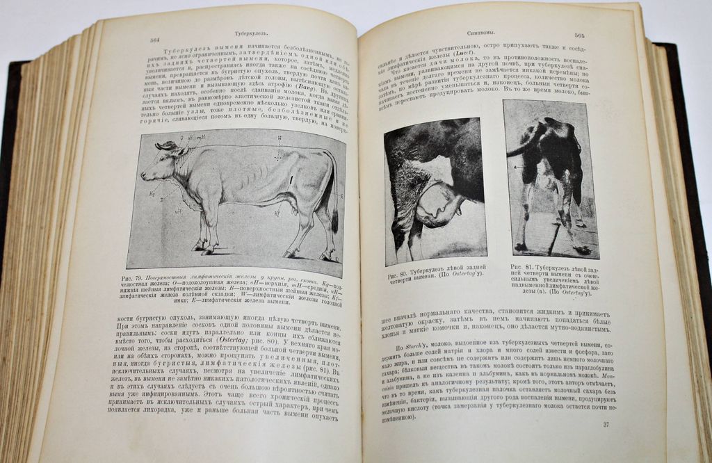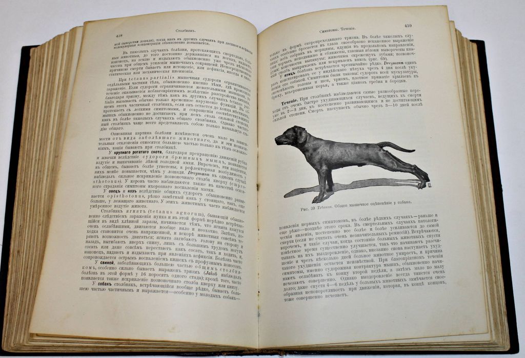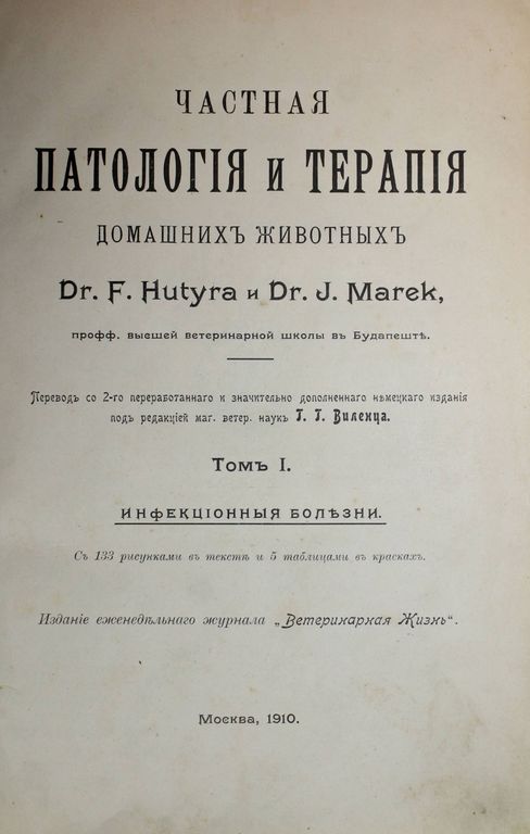 Dr. Hutyra F., Dr. Marek J. Частная патология и терапия домашних животных. Том 1: Инфекционные болезни. Издание еженедельного журнала `Ветеринарная Жизнь`. М.: Печатня А.Снегиревой, 1910. – XII, 818 с., ил., 1 л. табл. Полукожаный переплет. Энциклопедический формат, 26.5х18 см. Хутьра (Hutyra) Ференц (1860 - 1934,) - енгерский эпизоотолог и микробиолог. Окончил высшую ветеринарную школу в Будапеште, затем был там ректором. Изучал туберкулез животных, чуму свиней. Совместно с Й.Мареком в 1905 выпустил капитальное руководство по патологии и терапии домашних животных, по которому училось несколько поколений ветеринарных врачей (многократно переводилось и издавалось на английском, итальянском, испанском, русском и других языках). Хорошее состояние. Небольшая потертость переплета.