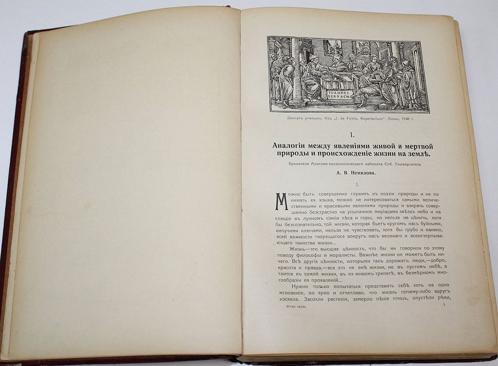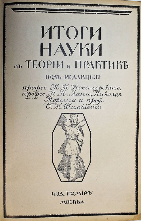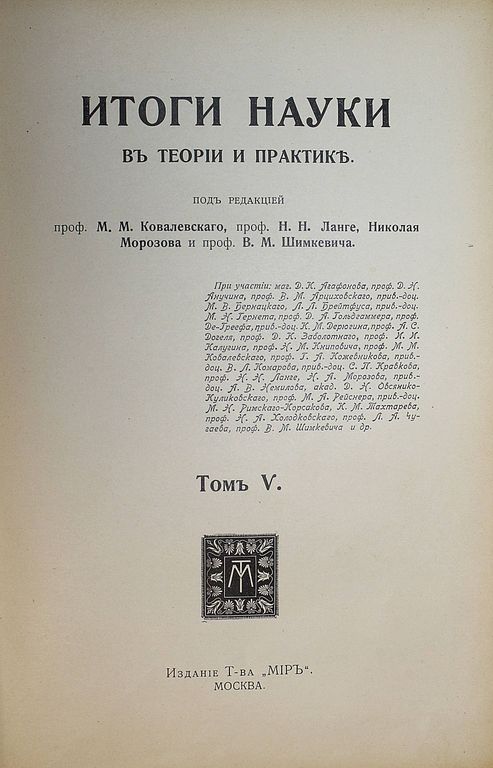 Итоги науки в теории и практике. [в 12 т.]. Том 5: Жизнь. Под ред. проф. М.М.Ковалевского, Н.Н. Ланге, Николая Морозова и В.М.Шимкевича. М.: Изд. Т-ва `Мир`, 1912. – [8], 378 с., ил., 21 л., ил. Издательский полукожаный переплет. Энциклопедический формат, 27.5х19 см. Богато иллюстрированный энциклопедический сборник, посвященный науке и ее развитию в контексте разных эпох. Тома сборника выходили не по порядку, а из 12 томов были изданы лишь 10. Хорошее состояние. Потертости переплета, небольшой дефект верха корешка.