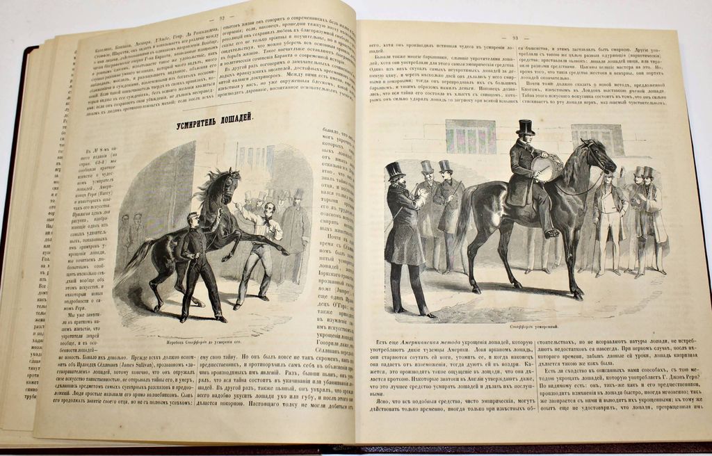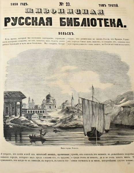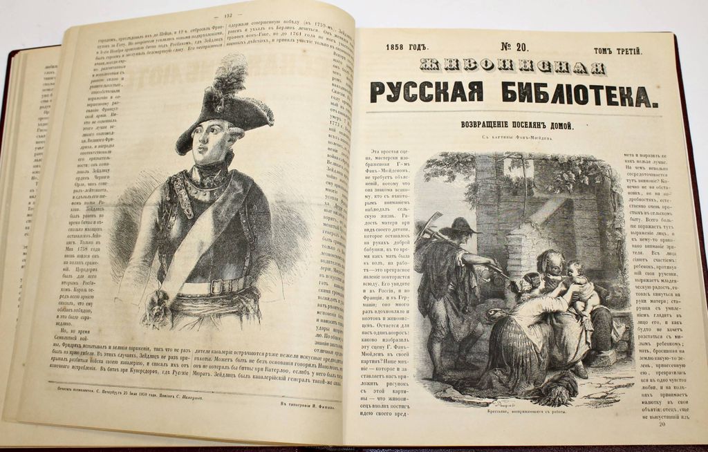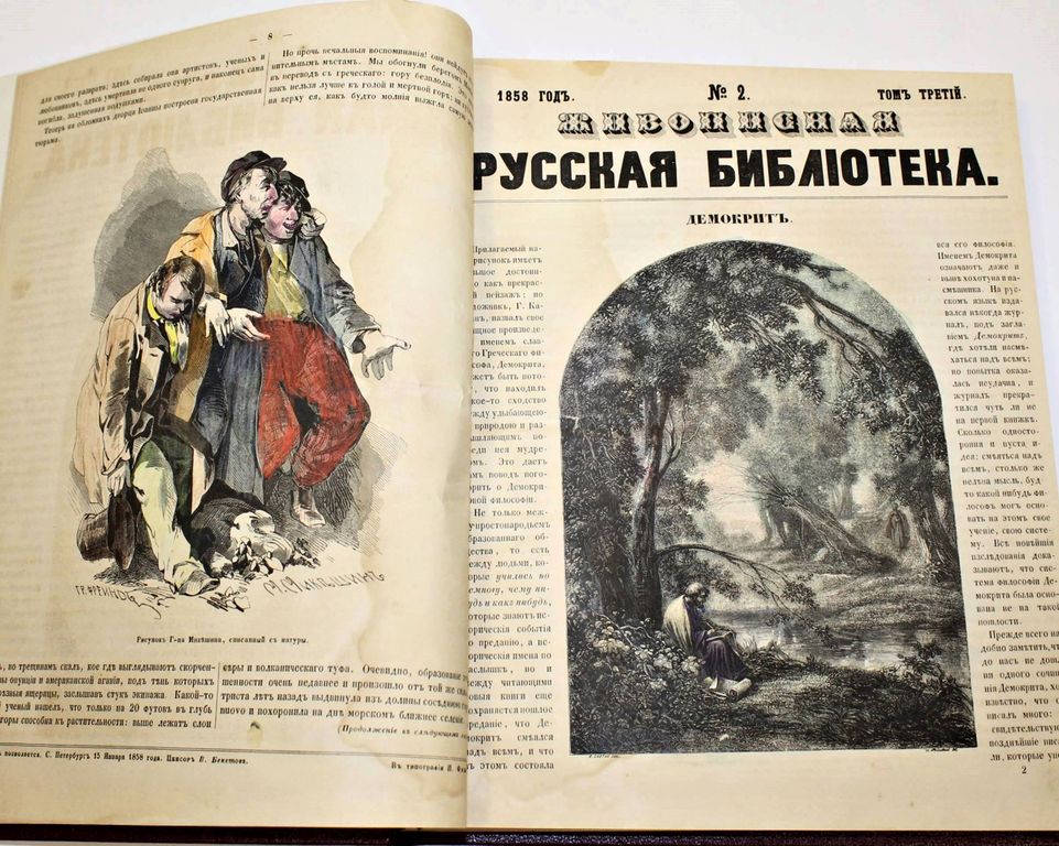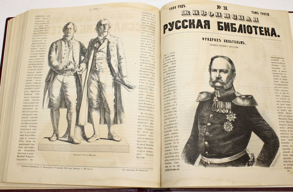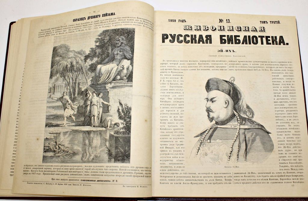 Живописная русская библиотека, издаваемая К.Полевым. Иллюстрированный журнал. Том третий. 1858 год. № 1-48. [Годовой комплект]. СПб.: В типография И.Фишона, 1858. – 381 с., ил. Во владельческом ледериновом переплете. Очень большой формат, 31х26,5 см. `Живописная русская библиотека` - иллюстрированный литературно-публицистический журнал, издававшийся в Санкт-Петербурге в 1856-1859 гг. под редакцией Ксенофонта Полевого. В журнале публиковались статьи на различные темы: живопись, достопамятные здания и памятники, промышленность, нравы и народные обычаи, география и этнография, литература и критика, биографические заметки. Очень редкий журнал, особенного годовой комплект! Хорошее состояние. Незначительные разводы на нескольких страницах, владельческая подкраска нескольких иллюстраций акварелью.