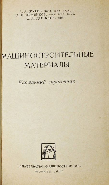 Жуков А.А., Лужников Л.П., Дынкина С.Я. Машиностроительные материалы. Карманный справочник. М.: Машиностроение. 1967г. 192 с. Приведены основные характеристики стандартизированных, а также некоторых новых машиностроительных материалов, их состав, физико-механические свойства, а в необходимых случаях - стойкость в агрессивных средах, технологические и эксплуатационные свойства, области применения. Даны общие принципы выбора основных материалов. Твердый переплет. Увеличенный формат. Хорошее состояние, потертость переплета.