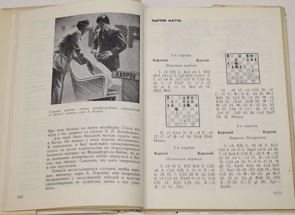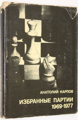 Карпов А. Избранные партии 1969 - 1977 гг. Серия: Выдающиеся шахматисты мира. М.: Физкультура и спорт. 1978. 256с.,ил.,порт.,факс. Эта книга о творчестве 12-го чемпиона мира гроссмейстера Анатолия Карпова. В нее вошли 55 партий, тщательно отобранных и прокомментированных автором. В примечаниях к ним находят отражение взгляды Карпова на шахматную борьбу, его творческие принципы. Во 2-е издание включены все партии мачта на первенство мира, а также материалы о победе Анатолия Карпова в Багио. Твердый переплет. Суперобложка. Обычный формат. Хорошее состояние, суперобл. с надрывами.