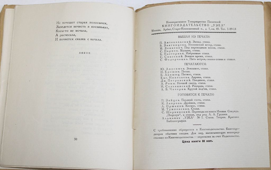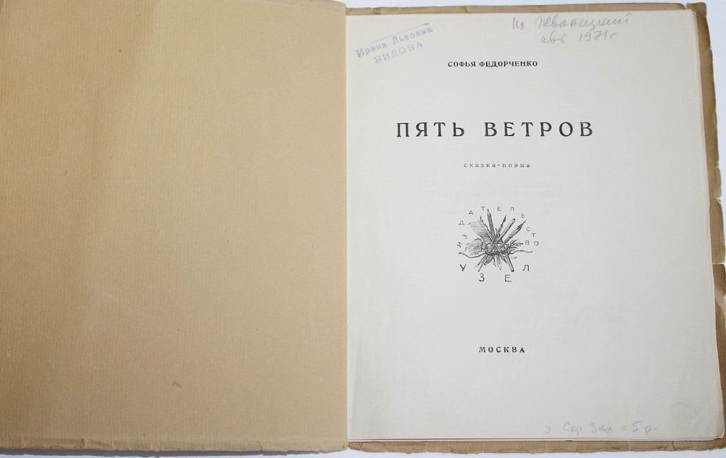Федорченко С. Пять ветров. Сказка – поэма. М.: Издательство `Узел`, [1925 – 1926]. – 30, [1] с. Мягкая издательская обложка с наклеенной маркой работы В.Фаворского. Обычный формат, 18х15. Прижизненное издание детской писательницы и романистки Софьи Захаровны Федорченко (1888-1959). Книга вышла в свет в издательстве артели `Узел`, созданном на основе поэтического кружка в который входили С. Парнок, Б. Пастернак, Б. Лившиц и др. Кружок собирался в 1925 году у известного издателя журнала `Недра` - П.Н. Зайцева в Староконюшенном переулке. Издательство исчезло в 1928 году с ужесточением цензуры и окончательным вмешательством государства в литературную жизнь. Розанов. № 4170, Турчинский. С. 553. Тираж 700 экз. Хорошее состояние. Владельческий штамп-экслибрис и надпись карандашом на титуле.