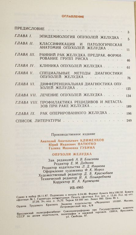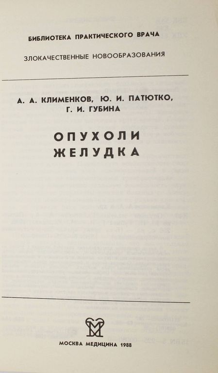 Клименков А.А., Патютко Ю.И., Губина Г.И. Опухоли желудка. Серия: Библиотека практического врача. М.: Медицина. 1988г. 256 с. Приведены классификации опухолей желудка, данные о статистике и эпидемиологии рака желудка. Раскрыта сущность понятия *ранний рак желудка*. Особое внимание уделено дифференциальной диагностике опухолей желудка. Описаны рентгенологическая и эндоскопическая семиотика новообразований, хирургическое, лекарственное, комбинированное лечение, профилактика рецидивов. Мягкий переплет. Обычный формат. Хорошее состояние.