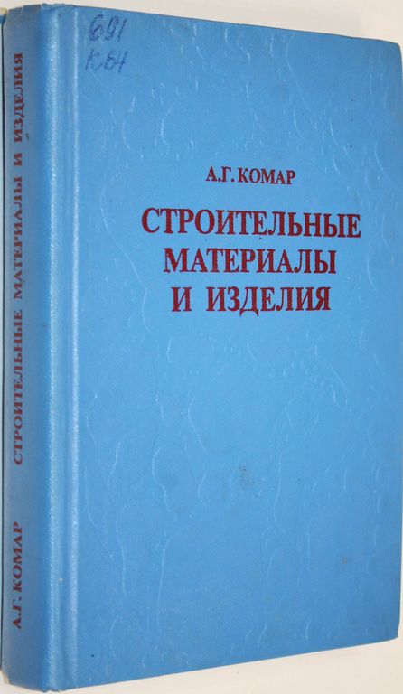 Комар А. Строительные материалы и изделия. М.: Высшая школа. 1976г. 535 с. В учебнике рассмотрена номенклатура важнейших групп строительных материалов, освещены теоретические основы, необходимые для правильной оценки свойств и качества изделий. Изложены основы технологии производства вяжущих материалов, сборных железобетонных и асбестоцементных, керамических материалов и изделий на основе полимеров и др. Дан сравнительный технико-экономический анализ эффективности производства и применения важнейших строительных материалов и изделий. Твердый переплет. Увеличенный формат. Хорошее состояние,библ. штампы.