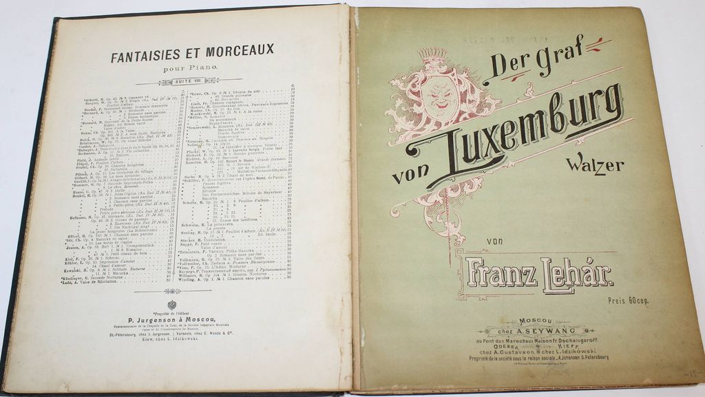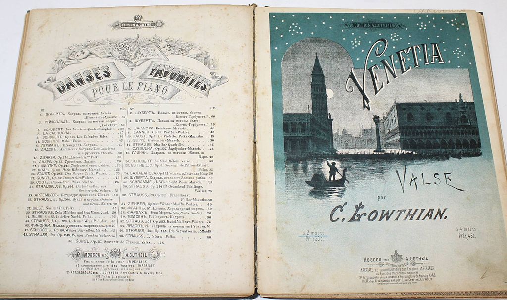 Конволют из 13 нотных изданий. М.: Изд. П.Юргенсона; А.Гутхейль; `Северная лира`, [190?]. – 124 с. нот разд. пагинац. Твердый коленкоровый переплет. Очень большой формат, 32х26 см. Состав комплекта: 1) Fr. List. Gounod. Вальс из оперы Фауст; 2) Fr. Luxemburg-Walzer. Вальс из оперетты `Граф Люксембург`; 3) Цирер К.М. Прелестная ночь. Вальс; 4) Фельдман К.В. Волшебная сказка; 5) Hollender V. Schaukel-Walzer. Качели-Вальс; 6) Waldteufel E. Un premier bouquet. Первый букет. Вальс; 7) Lowthian C. Venetia. Венеция. Вальс; 8) Тидеман К. Одной тебе. Вальс; 9) Berger R. Reponse a `Amoureuse`. Вальс; 10) Фельдман К.В. Цыганская кровь. Вальс; 11) Gounod. Valse-Ariette. Вальс из оперы `Ромео и Джульетта`; 12) Мазурин К.М. Маня. Вальс; 13) Аксельрод А. Сакварело. Грузинский вальс. Удовлетворительное состояние.