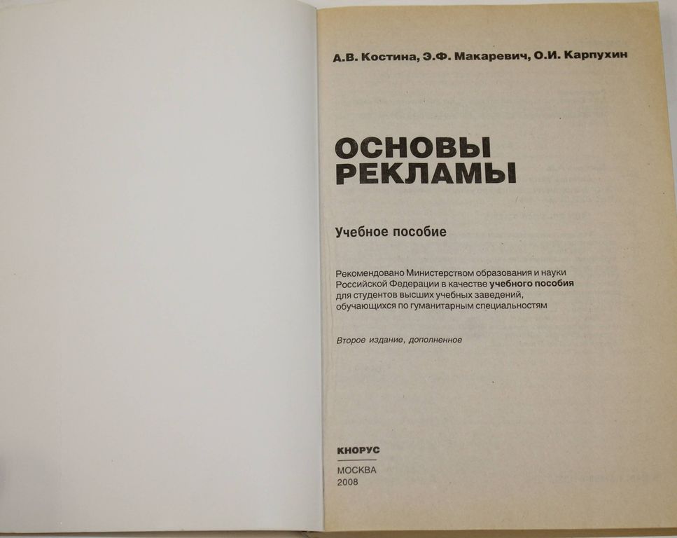 Костина А.В. Основы рекламы. Учебное пособие. М.: КНОРУС. 2008. 200 руб. В корзину Описание Описание Костина А.В. Основы рекламы. Учебное пособие. М.: КНОРУС. 2008. 400с. Твердый переплет. Обычный формат. Хорошее состояние. Вас также может заинтересоватьВ корзинуСиняева И.М. Сфера PR в маркетинге. Учебное пособие. М.: ЮНИТИ- ДАНА. 2007.200 ₽ В корзинуВ корзинуСафрончук М.В. Микроэкономика. Курс лекций. М.: Эксмо. 2005г.200 ₽ В корзинуВ корзинуМокров Г.Г. Принципы рыночной экономики. Учебное пособие. М.: Юркнига. 2005.200 ₽ В корзинуВ корзинуГлызина М.П. Современный менеджмент. Учебное пособие. Ростов-на-Дону: Феникс. 2009.200 ₽ В корзину