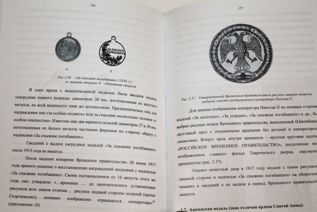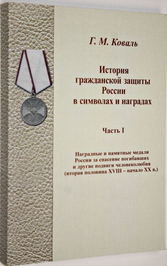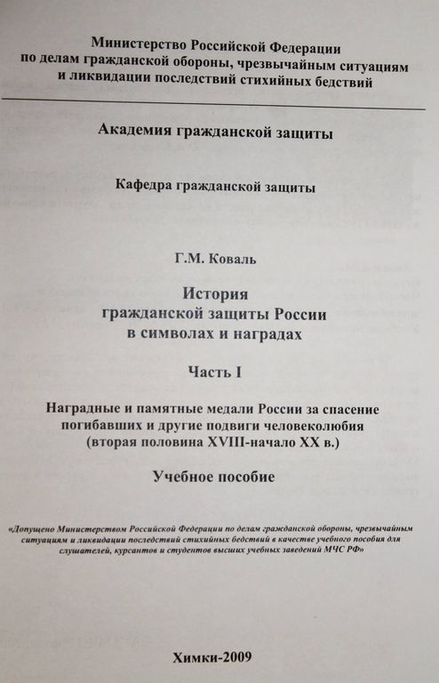 Коваль Г.М. История гражданской защиты России в символах и наградах. Часть 1. Наградные и памятные медали за спасение погибших и другие подвиги человеколюбия. Химки: АГЗ МС России. 2009. 312с.,ил. В пособии на основе материалов государственных архивов, музеев, трудов научных деятелей прошлых лет и современности по фалеристике впервые через историю наградных и памятных медалей за спасение людей в чрезвычайных ситуациях мирного и военного времени в доступной и увлекательной форме рассказывается о чрезвычайных ситуациях природного и техногенного характера в истории России, о деятельности государственных и общественных органов по их ликвидации. Тираж 200 экз.Мягкий переплет. Обычный формат. Отличное состояние.