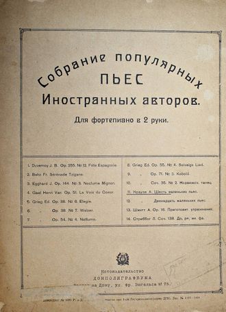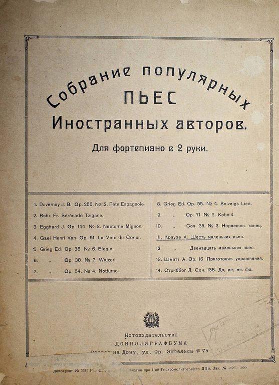 Краузе А. Шесть маленьких пьес. Собрание популярных пьес иностранных авторов. Для фортепиано в 2 руки. Ростов-н/Д: Донполиграфбум, [1926]. – 6 с., нот. Мягкая обложка. Очень большой формат, 32х24 см. Антон Краузе (1834 - 1907) - немецкий дирижёр, пианист и композитор. Краузе принадлежат многочисленные фортепианные пьесы дидактического назначения, а также вокальные сочинения. Хорошее состояние. Реставрация, владельческие карандашные пометки.