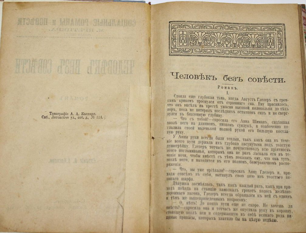 Кретцер М. Человек без совести. Роман. Серия: Социальные романы и повести М.Кретцера. СПб.: Издание А.А.Каспари, б.г. – 208 с. Владельческий составной переплет. Обычный формат, 20х14 см. Макс Кретцер (1854 - 1941) - немецкий беллетрист. Был сначала рабочим, затем купцом; сотрудник социал-демократических изданий и один из немецких реалистов. Хорошее состояние. Реставрация тит. листа.