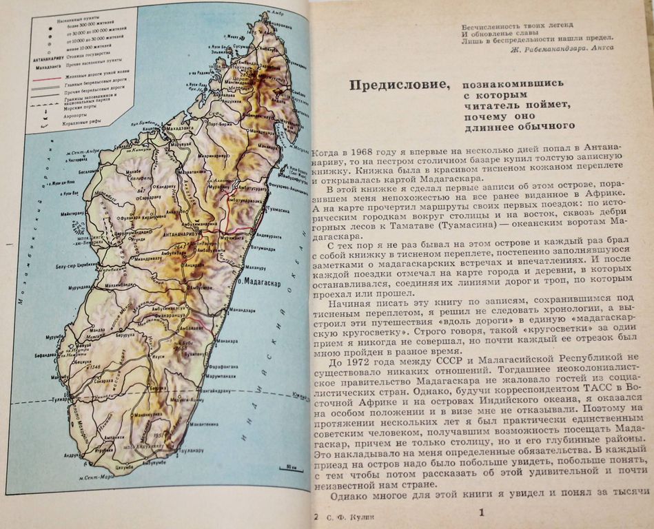 Кулик С. Когда духи отступают. М.: Мысль. 1981г. 223 с.,32л.ил. Книга посвящена Мадагаскару. Автор рассказывает о верваниях, обычаях, образе жизни малагасийцев, о пестрой этнографии острова, повествует, как под влияниям пропаганды новых идей уходит в прошлое вера в духов предков. Многие страницы книги рассказывают об эндемичной флоре и фауне Мадагаскара - древних растениях и животных, вымерших повсюду, кроме этого замечательного острова. Твердый переплет. Увеличенный формат. Хорошее состояние, загрязн. переплета.