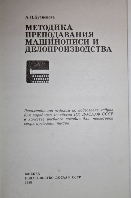 Кузнецова А.Н. Методика преподавания машинописи и делопроизводства. Учебное пособие. М.: ДОСААФ. 1988г. 208с.,ил. В книге раскрываются единство и взаимосвязь различных направлений воспитательного процесса, обеспечивающих гармоничное, развитие личности младшего школьника. Показаны методика и опыт формирования духовного мира учащихся - их интеллекта, эмоций, воли, творческого потенциала. Книга предназначена для учителей начальных классов, воспитателей групп продленного дня и детских домов, пионервожатых, родителей. Мягкий переплет. Обычный формат. Хорошее состояние.