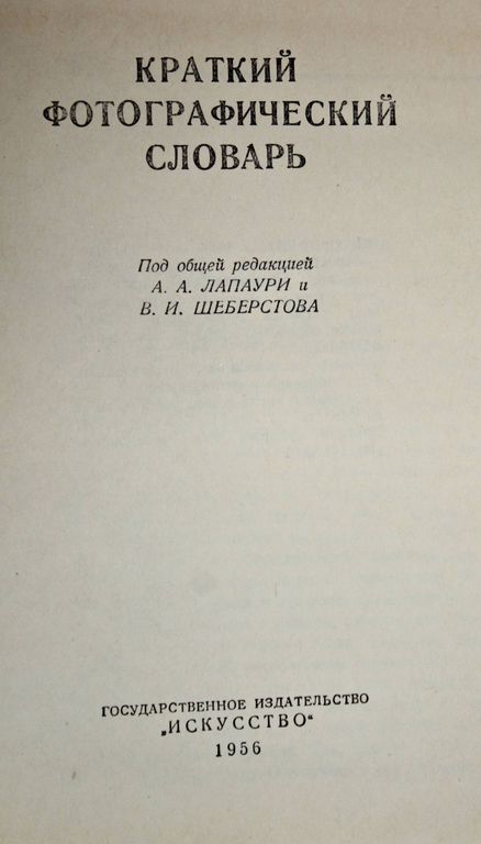 Краткий фотографический словарь. Под общей редакцией Лапаури А.А., Шеберстова В.И.. М.: Искусство. 1956г. 386с. В книге дается толкование наиболее распространенных фотографических терминов. Одновременно книга может служить справочником по различным вопросам фотографии: съемке, оптике, обработке светочувствительных материалов. Твердый переплет. Обычный формат. Хорошее состояние.