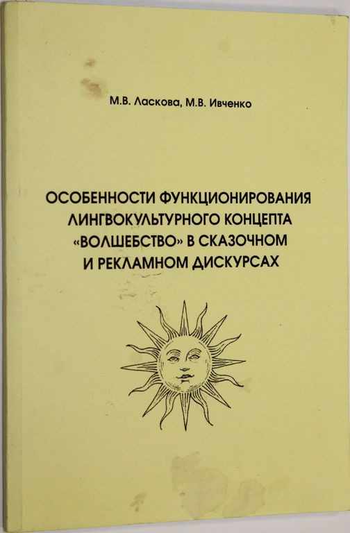 Ласкова М.В., Ивченко М.В. Особенности функционирования лингвокультурного концепта «волшебство» в сказочном и рекламном дискурсах. Ростов-на-Дону: ИПО ЮФУ. 2013. 116с. Монография посвящена анализу лексико-семантического, этимологического и этнолингвистического аспектов лингвокультурного концепта «волшебство» в рамках концептосфер русского, английского и французского языков. Концепт «волшебство» рассматривается в данной работе с учетом его полевой структуры и лексико-семантических особенностей, которые находят свое яркое воплощение в сказочном и рекламном дискурсах. Адресуется лингвистам широкого профиля – специалистам по лингвокультурологии, концептологии, межкультурной коммуникации, этнолингвистике и прагмалингвистике. Мягкий переплет. Обычный формат. Хорошее состояние,небольш.загрязн. обл.