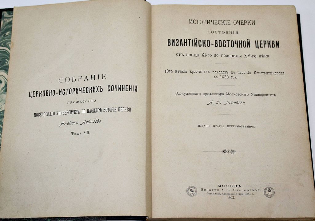 Лебедев А.П. Исторические очерки Византийско-Восточной церкви от конца XI-го до половины XV-го века. (От начала крестовых походов до падения Константинополя в 1453 г.). М.: Печатня А.И.Снегиревой, 1902. – [4], IV, 489 с. В современном полукожаном переплете. Увеличенный формат, 22х16.5 см. Алексей Петрович Лебедев (1845—1908) - выдающийся церковный историк, профессор Московской духовной академии и Московского университета, составитель наиболее масштабного курса истории Восточной церкви. Профессор А.П. Лебедев пользовался огромной популярностью у студентов, его аудитория была одной из самых посещаемых. Это был единственный в Академии профессор, ежегодно предлагавший новые курсы. Из его `школы` вышли более десяти магистров. Хорошее состояние.