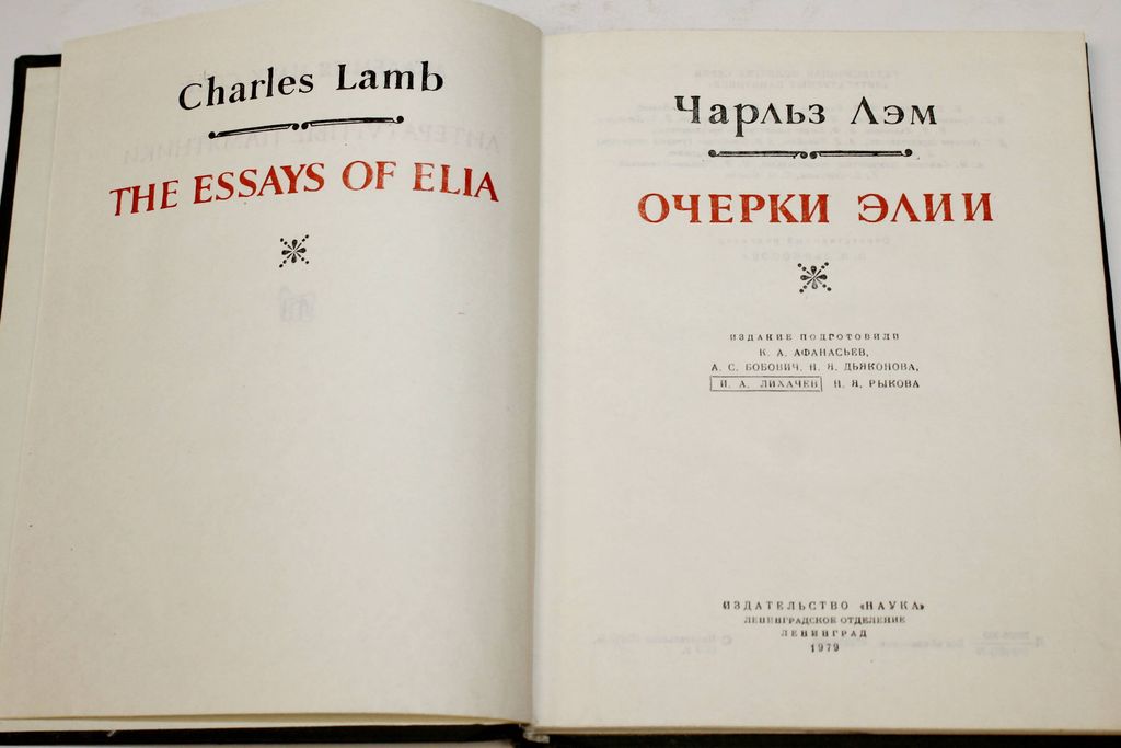 Лэм Чарльз. Очерки Элии. Серия: Литературные памятники. Л.: Наука. 1979г. 260с. В настоящее издание вошел целиком первый сборник Лэма (1755-1834) - `Очерки Элии`, представляющий, по мнению критиков, значительно больший художественный интерес, нежели второй. Но пять лучших очерков из второго сборника, весьма существенных для характеристики личности и творчества писателя, даются в `Дополнениях`. Из этих же соображений дается (с небольшими сокращениями) очерк Вильяма Хэзлитта `Элия и Джеффри Крейон`. Перевод с английского А.С.Бобовича и Н.Я.Дьконовой, стихи в переводе Н.Я.Рыковой. Заключительная статья Н.Я.Дьяконовой. Твердый переплет. Энциклопедический формат. Хорошее состояние.