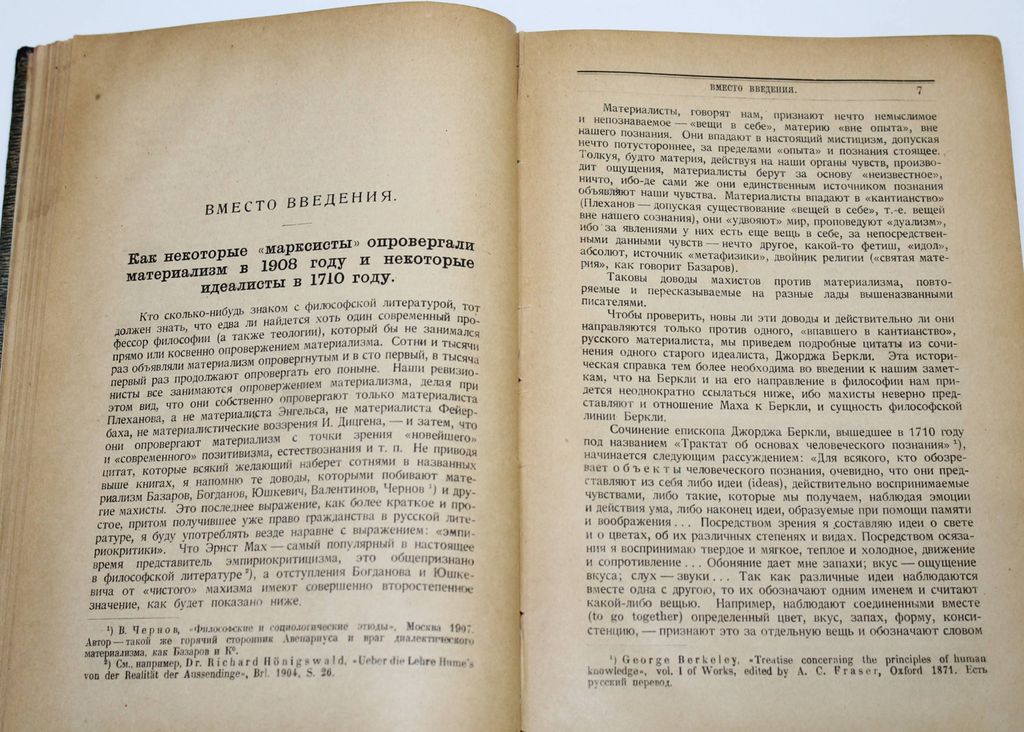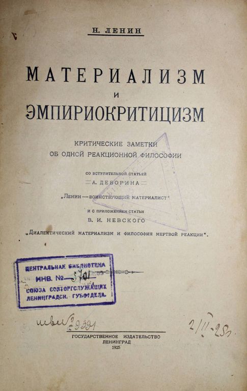 Ленин Н. Материализм и эмпириокритицизм. Критические заметки об одной реакционной философии. Л.-М.: Государственное изд., 1925. – XL, 306 с. Владельческий составной переплет. Увеличенный формат, 22.5х15.5 см. Со вступительной статьей А. Деборина `Ленин-воинствующий материалист` и с приложением статьи В.И. Невского `Диалектический материализм и философия мертвой реакции`. Основной философский труд В. И. Ленина посвящен критике субъективно-идеалистической философии эмпириокритицизма, обоснованию и развитию важнейших положений диалектического и исторического материализма, обобщению крупнейших открытий естествознания новейшего времени. Книга служит идейным оружием в борьбе против буржуазной философии и ревизионизма. Работа написана во второй половине 1908 года. Напечатана в 1909 году отдельной книгой в издательстве `Звено` под псевдонимом Вл. Ильин. Хорошее состояние. Небольшая потертость переплета, списанный библиотечный экземпляр.