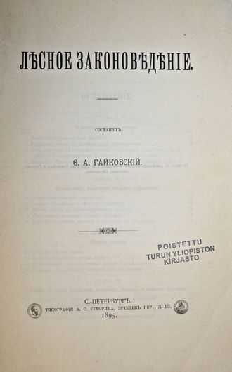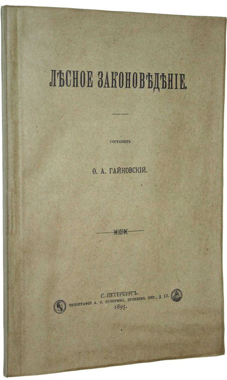 Гайковский Ф.А. Лесное законоведение. СПб.: Тип. А.С.Суворина, 1895. – X, 178, 72 с. Мягкая обложка. Увеличенный формат, 24.5х16.5 см. Хорошее состяние. Реставрация последнего листа, штамп зарубежной библиотеки, обложка восстановлена с оригинала.