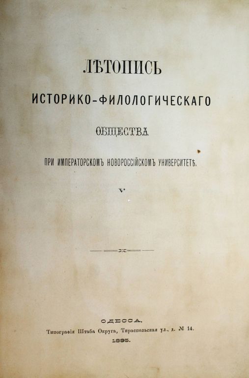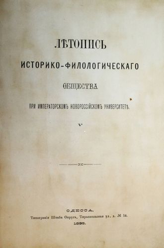Летопись Историко-филологического общества при Императорском Новороссийском университете. Вып. V. Одесса: Тип. Штаба Округа, 1895. – [6], 15, [3], XII, 368 с., 8 л. табл. В цельноколенкоровом переплете. Энциклопедический формат, 27х19 см. Летопись Историко-филологического общества при Императорском новороссийском университете – научный сборник, выходил в Одессе с 1890 по 1916. Вышло 25 выпусков, в которых публиковались научные труды профессоров и приват-доцентов византийского и византийско-славянского отделений историко-филологического факультета. Хорошее состояние. Незначительная потертость переплета, тит. лист и с. 17 `мытые`.