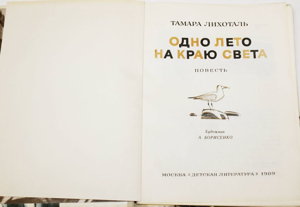 Лихоталь Т.В. Одно лето на краю света. Повесть. Худ. А. Борисенко. М.: Детская литература. 1989г. 143 с., ил. Повесть о мальчике Жеке, который живет на одном из небольших Курильских островов. Нет на этом острове других мальчиков и девочек. А есть только солдаты пограничной заставы, очень хорошие люди. С ними дружит герой этой повести, от которых он воспринимает все лучшее: любовь к Родине, честность, мужество, выносливость, верность долгу. Твердый переплет. Увеличенный формат. Хорошее состояние.
