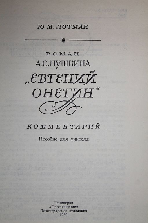 Лотман Юрий. Роман А.С.Пушкина `Евгений Онегин` Комментарий. Пособие для учителя. Л.: Просвещение. 1980г. 416 с. Книга, написанная видным советским ученым, содержит пояснения к тексту романа А.С.Пушкина, которые помогут глубже понять произведение, познакомят читателя с эпохой, изображенной в романе, деталями ее быта, историческими лицами, событиями, литературными произведениями и т. д. Комментарий поможет учителю при изучении пушкинского романа, даст ему возможность исторически конкретно и широко истолковать произведение. Твердый переплет. Обычный формат. Хорошее состояние.