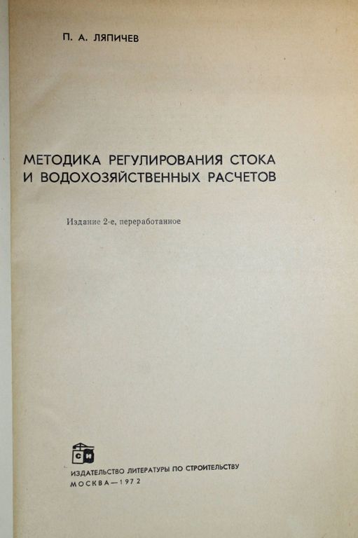 Ляпичев П.А. Методика регулирования стока и водохозяйственных расчетов. М.: Изд-во лит. по строительству. 1972г. 270с. В книге изложены основные методы регулирования стока и водохозяйственных расчетов для простых и сложных типов и видов годичного, многолетнего и су¬точного регулирования стока, в том числе совокупность методов автора для установления: гарантированного и общего режима, сезонных отдач, правил регулирования, диспетчерских контрольных графиков и т.д. Рассмот¬рены необходимые для расчетов основные характерис¬тики стока и водохранилищ, а также регулирование и переброска стока при возведении комплексных гидро¬технических сооружений. Твердый переплет. Энциклопедический формат. Хорошее состояние.