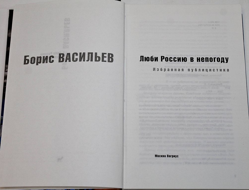 Васильев Б. Л. Люби Россию в непогоду. М.: Вагриус. 2006г. 400 с. Известного прозаика Бориса Васильева всегда интересовала история в ее переломных точках. В новой книге, составленной из очерков и заметок разных лет, писатель снова пытается разобраться в прошлом и настоящем России, чтобы лучше понять, что ждет ее в будущем. Его публицистика продолжает традиции Чаадаева, Герцена, Короленко - великих наших соотечественников, умевших любить Россию в непогоду`, в моменты потрясений и испытаний. Твердый переплет. Обычный формат. Очень хорошее состояние, влад. пометки.