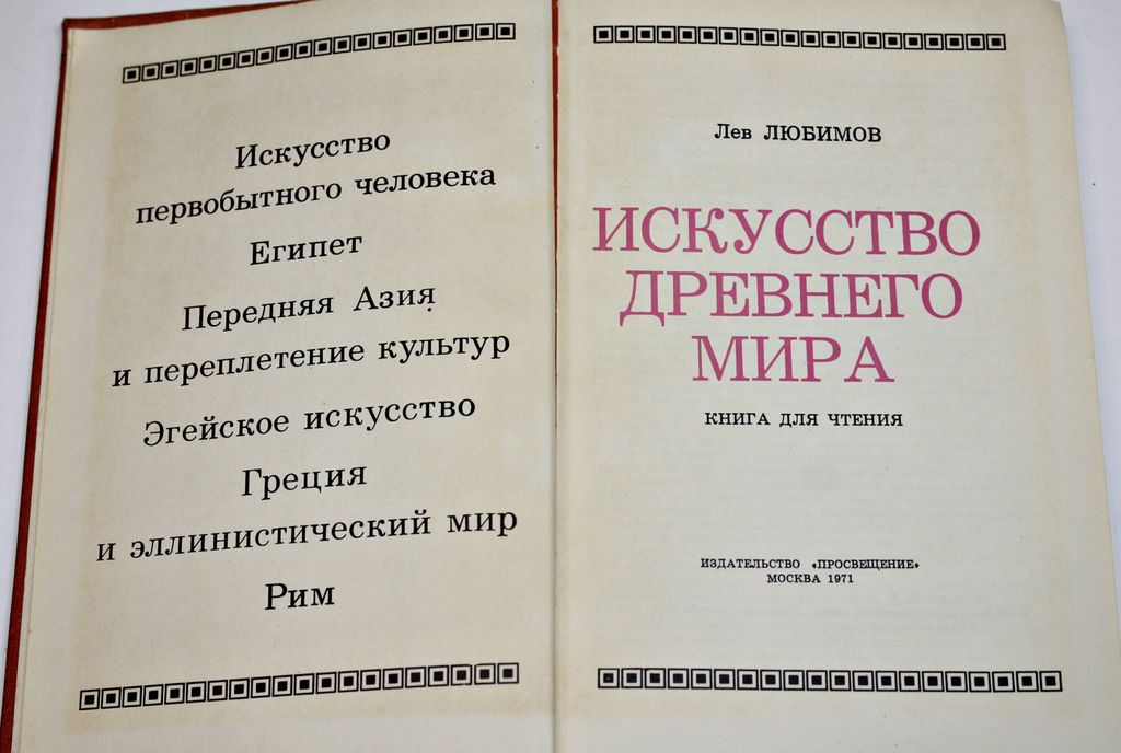 Любимов Л. Искусство древнего мира. Книга для чтения. М.: Просвещение. 1971г. 319с.,ил. `В книге Искусство Древнего Мира разделы: Искусство первобытного человека, Египет, Передняя Азия и переплетение культур, Эгейское искусство, Греция и эллинистический мир, Рим. В книге Искусство Древней Руси: Византийская художественная система, Фундамент древнерусской художественной культуры, Киевская держава, Владимиро-Суздальская твердыня, О значении и судьбах древнерусской иконописи, Господин Великий Новгород, Москва, Семнадцатый век. В Книге Искусство Западной Европы: Средние века и Возрождение Италии. В книгах много иллюстраций, в том числе цветных `Твердый переплет. Увеличенный формат. Хорошее состояние.