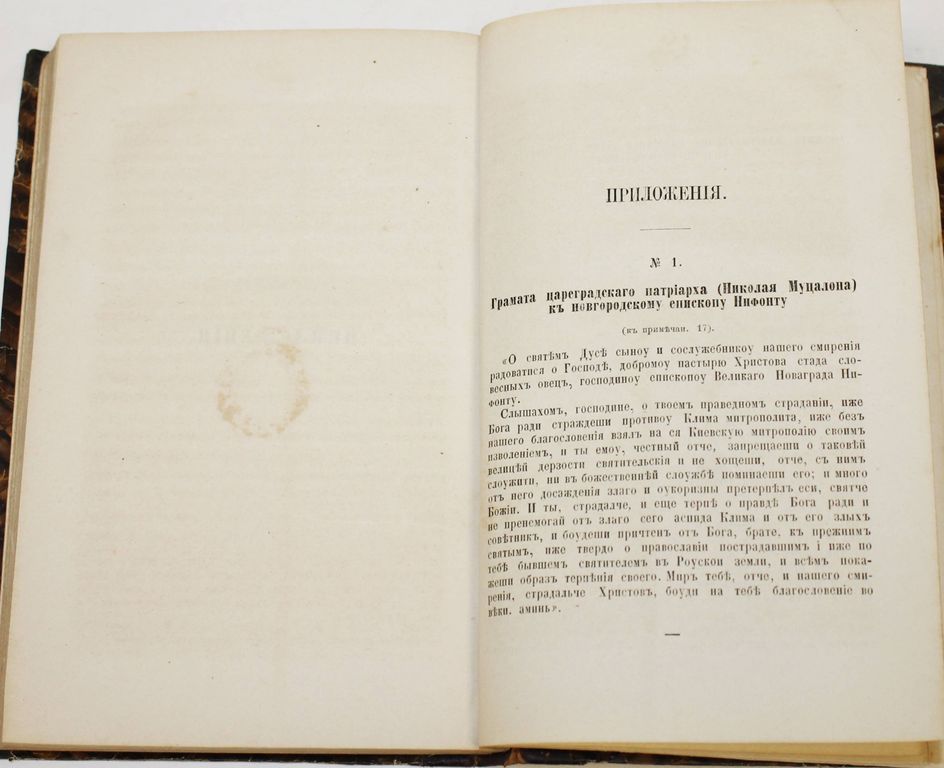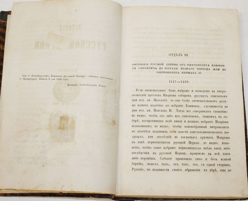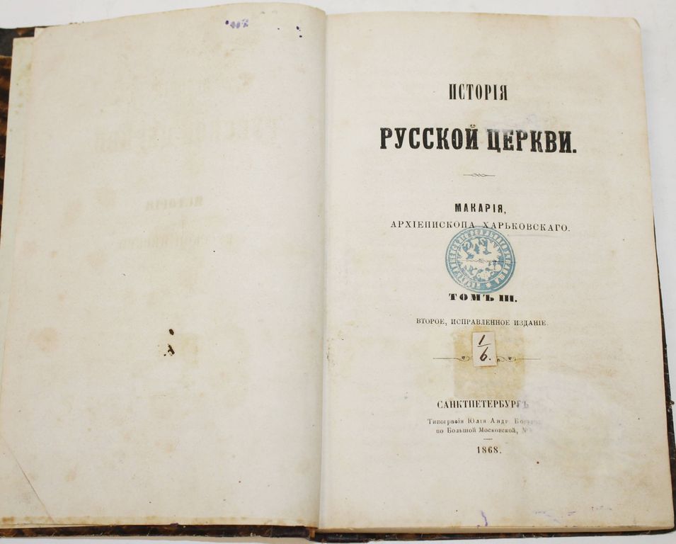 Макарий (Булгаков М.П.). История русской церкви. Макария, епископа винницкого. [В 12 т.]. Том 3. СПб.: Типография Юлия Андр. Бокрама, 1868. – 322, V с. В полукожаном переплете эпохи. Увеличенный формат, 22х14.5 см. Митрополит Макарий (в миру Михаил Петрович Булгаков) (1816 - 1882) - епископ Православной Российской Церкви, историк церкви, богослов, митрополит Московский и Коломенский. Ординарный академик Академии наук. Его главным трудом считается `История Русской Церкви` - фундаментальное двенадцатитомное исследование, которое до сих пор остается самым полным трудом по истории Русской Церкви. Хорошее состояние. Небольшая потертость переплета, следы сведения печатей, дореволюционный штамп на титуле.
