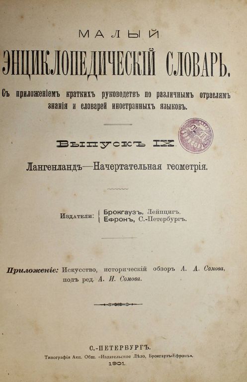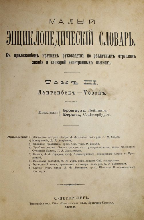 Малый энциклопедический словарь. С приложением кратких руководств по различным отраслям знания и словарей иностранных языков. Том III. Лангенбек-Иссоп. СПБ.: Тип. Акц. Общ. `Издательское дело, Брокгауз-Ефрон`, 1902. – 2094 стлб., ил. Полукожаный переплет. Энциклопедический формат, 26х20 см. Удовлетворительное состояние. Экслибрисы с короной.