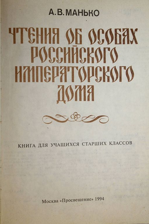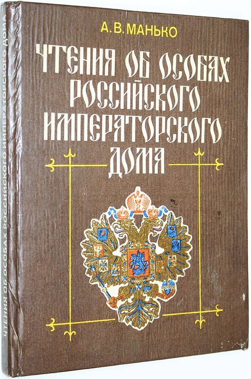 Манько А.В. Чтения об особах Российского императорского дома. М.: Просвещение. 1994г. 176 с., ил. Книга профессора А.В.Манько представит несомненный интерес для широкого читателя. В ней можно прочитать о семействе Петра Великого, о двух Аннах в русской истории (Анне Иоанновне и Анне Леопольдовне), о 186 днях внука Петра I (Петре III), о любимом внуке великой бабки (Александре I), о голгофе последнего императора России Николая II и о многих других интересных событиях и судьбах. В книге использованы архивные фотоматериалы. Твердый переплет. Увеличенный формат. Хорошее состояние.