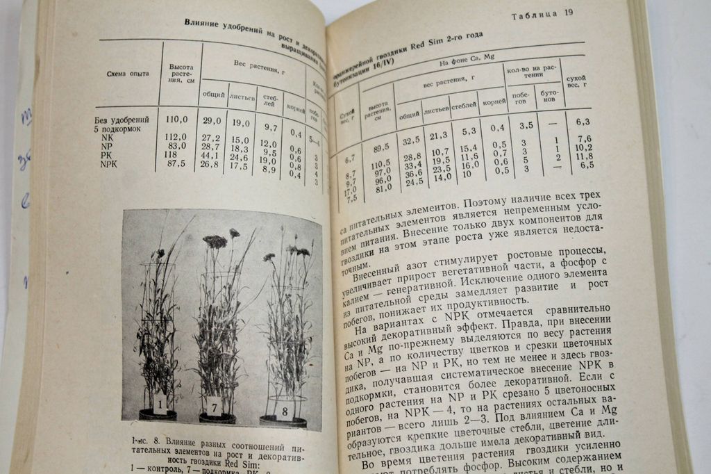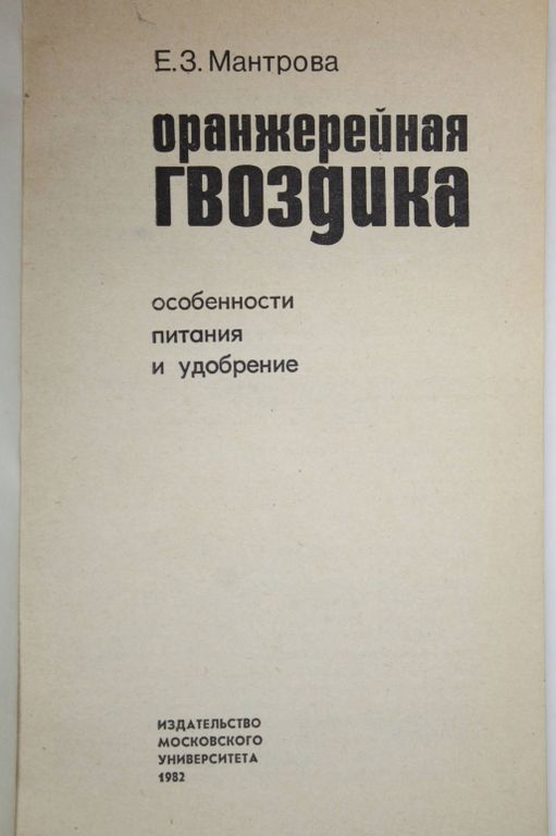 Мантрова Е. З. Оранжерейная гвоздика. Особенности питания и удобрения. М.: Изд-во Московского университета. 1982г. 200с.,ил. В книге приводятся экспериментальные данные по применению удобрений под оранжерейную гвоздику, изучена потребность в питательных элементах в отдельные фазы роста, дана количественная и качественная характеристика потребности, позволяющая научно обосновать систему питания, придается большое значение установлению коррелятивной зависимости между кальцево-агниевым и углеводным обменом и продуктивностью оранжерейной гвоздики. Мягкий переплет. Обычный формат. Хорошее состояние, дарствен. надпись.