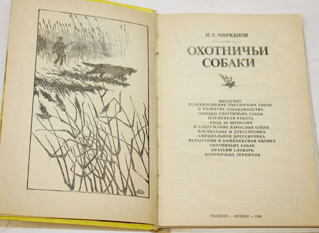 Марканов Н.А. Охотничьи собаки. Ташкент: Мехнат. 1990г. 192с., ил. Основные разделы: Введение.- Возникновение охотничьих собак и развитие собаководства.- Породы охотничьих собак. Племенная работа.- Уход за щенками и содержание взрослых собак.- Воспитание и дрессировка.- Специальная дрессировка.- Испытания и комплексная оценка охотничьих собак.- Краткий словарь охотничьих терминов. Твердый переплет. Обычный формат. Хорошее состояние.