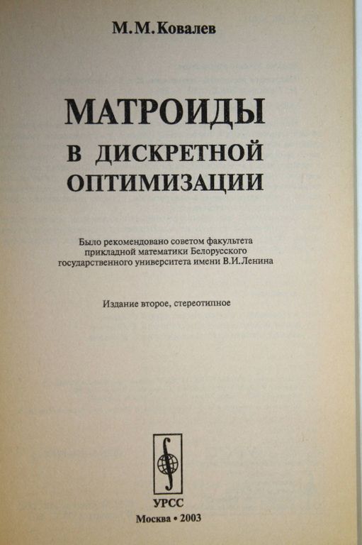 Ковалев М.М. Матроиды в дискретной оптимизации. М.: Едиториал УРСС. 2003г. 224с. Настоящая книга содержит основные положения теории матроидов - теории, приобретающей повышенный интерес у специалистов различных областей науки и техники. Обобщены результаты по применению матроидов в дискретной оптимизации для анализа эффективности эвристических и приближенных методов. Содержатся результаты по дискретному выпуклому анализу и матроидным структурам. Значительное внимание уделяется экстремальным задачам на графах и сетях. Исследуются нелинейные потоковые задачи с полиматроидными ограничениями, а также транспортные задачи и задачи расчета электрических схем. Предназначена для научных работников и инженеров, занятых проблемами оптимизации в системах автоматизированного проектирования и управления. Может быть использована студентами и аспирантами, специализирующимися по прикладной математике. Мягкий переплет. Обычный формат. Отличное состояние.