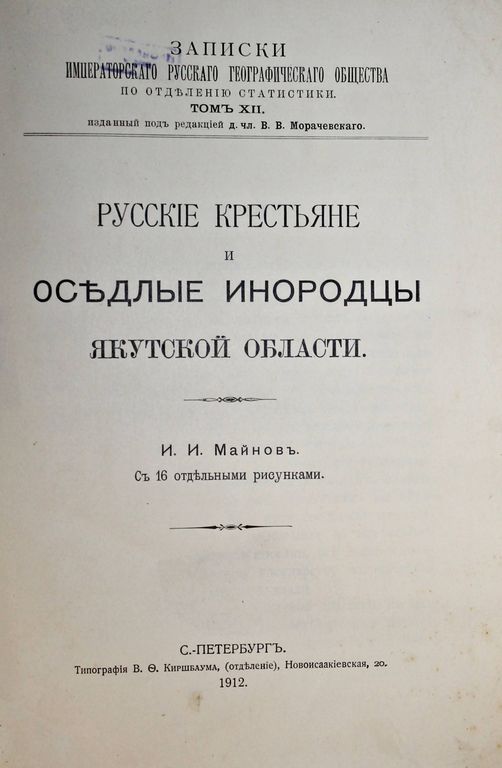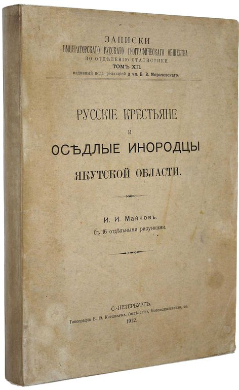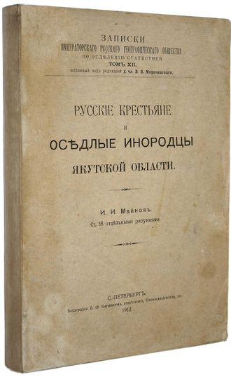 Майнов И.И. Русские крестьяне и оседлые инородцы Якутской области. С 16 отдельными рисунками. Записки Императорского Русского географического общества по отд. Статистики. Том XII, изданный под ред. В.В.Морачевского. СПб.: Тип. В.Ф.Киршбаума, 1912. – XVI, [4], 358, 30 с., 16 л. ил. В мягкой издательской обложке. Увеличенный формат, 23.5х16.5 см. Майнов Иван Иванович (1861 - 1936) - революционер-демократ, историк революционного движения, этнолог, занимался обработкой собранных им в Якутской области антропологических и статистических материалов. За эти труды получил от Общества любителей естествознания, антропологии и этнографии золотую медаль. В издании впервые подробнейшим образом рассматривается состояние, быт и хозяйство некоренного населения Якутии. Хорошее состояние.` Мытый` экземпляр.