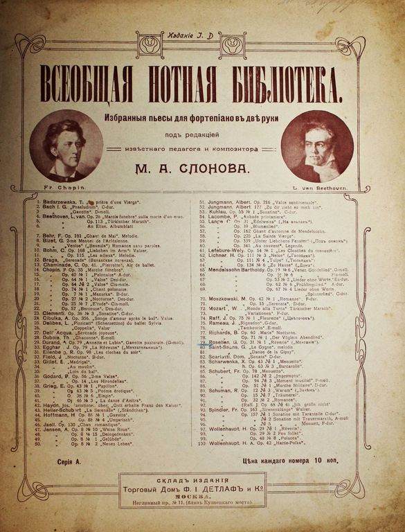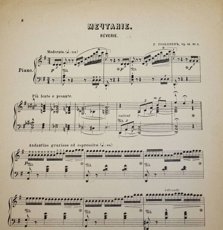 Мечтание. №1. Ор.31. Муз. Г.Розеллен. Всеобщая нотная библиотека. Избранные пьесы для фортепиано в две руки под ред. изв. педагога и композитора М.А.Слонова. М.: Печатня В.Гроссе, 189?. – 6 с., ил. Мягкая обложка. Очень большой формат, 35х26 см. Хорошее состояние. Небольшие надрывы и загрязнения.