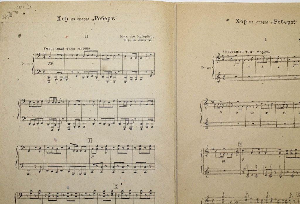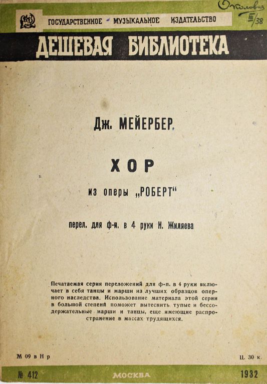 Мейербер Дж. Хор из оперы `Роберт`. Перел. Для ф.-п. в 4 руки Н.Жиляева. М.: Музгуз, 1932. – 10 с., нот. Мягкая обложка. Энциклопедический формат, 25х17.5 см. Джакомо Мейербер (1791 - 1864) - немецкий французский композитор еврейского происхождения. В 1831 году, с рождением его оперы `Роберт-дьявол` и опер его преемников, возник жанр `Большой французской оперы`. Хорошее состояние.