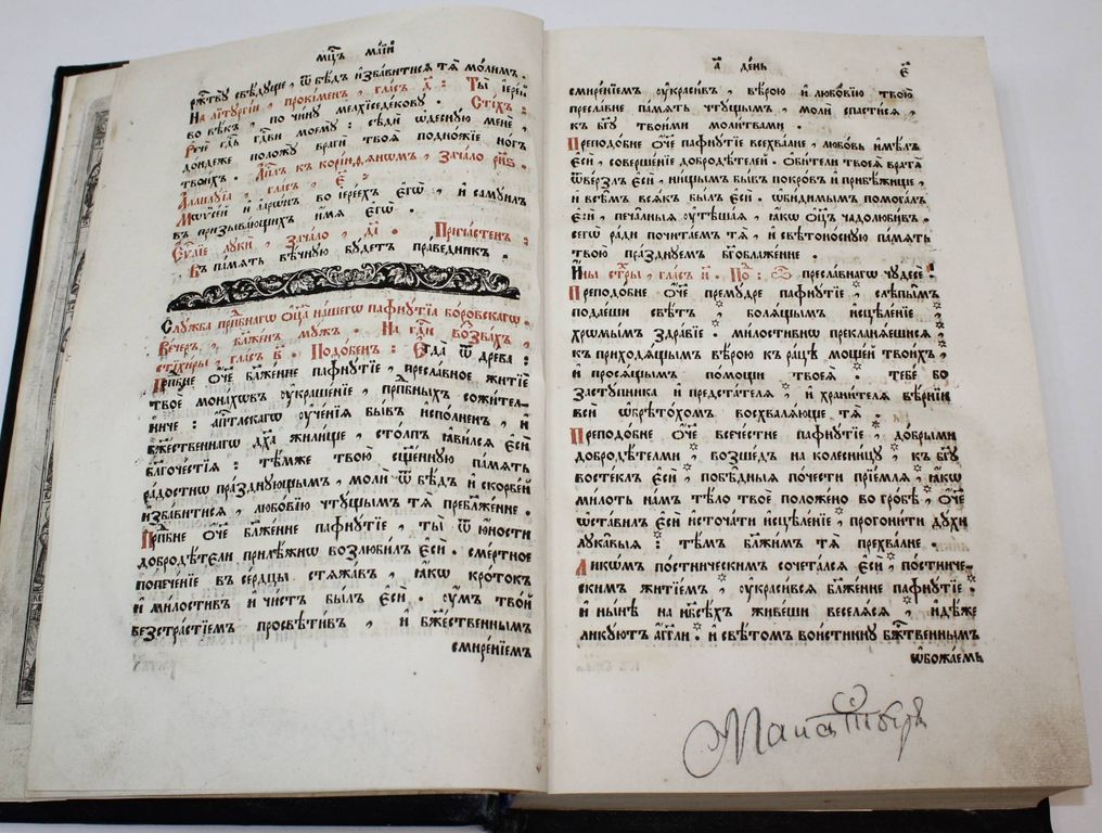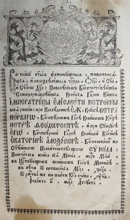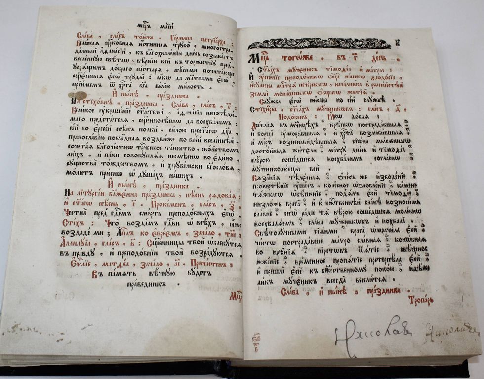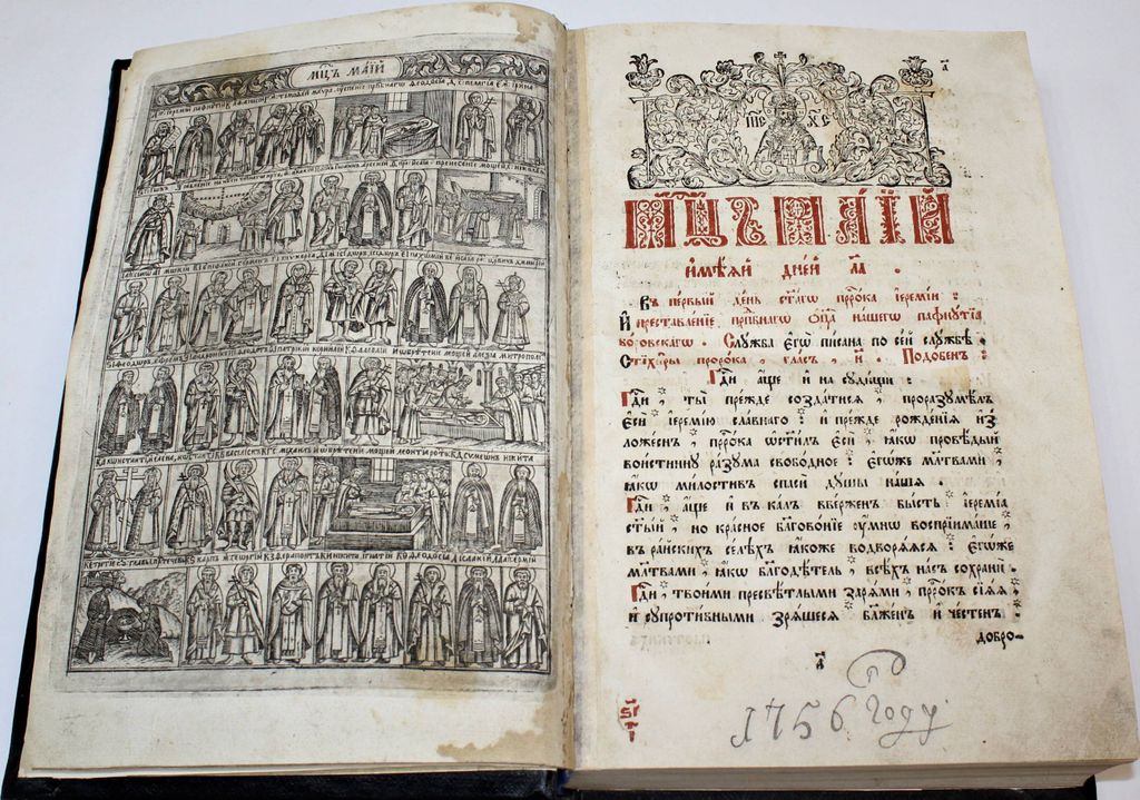 Минея. Месяц май. М.: Синодальная тип., 1754. – [1], 311, 16 л., 1 л. грав. Поздний владельческий переплет на досках сер. 20 в. Печать в две краски, заставки, концовки, инициалы. Очень большой формат, 32.5х21.5 см. Минея - в православной церкви богослужебные книги и книги для чтения, содержащие жития святых, сказания о церковных праздниках и поучения. Тексты в Минеях располагаются по дням каждого месяца соответственно с праздниками и днями памяти святых. В Минеях служебных, предназначенных для богослужения, гимнографические тексты располагаются в последовательности их чтения или пения на Вечерне, Утрене, иногда также на Часах, Литургии, Повечерии и др. Минеи месячные чаще содержат богослужебные тексты на один месяц, полный комплект миней содержит двенадцать книг. Очень хорошее состояние. Владельческие маргиналии 18 века.