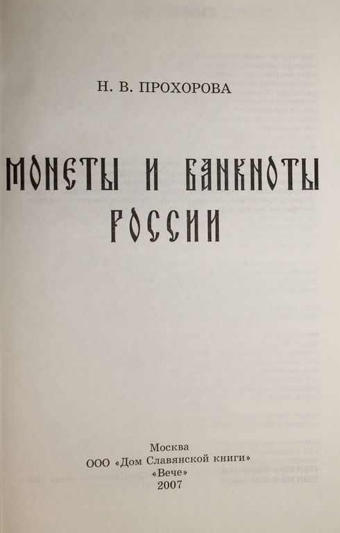 Прохорова Н.В. Монеты и банкноты России. М.: Дом Славянской книги. 2007г. 352 с., ил. Книга посвящается изучению истории возникновения денежного общения России со времен Владимира Великого до наших дней. Здесь рассматриваются предпосылки появления отдельных монет и банкнот, события, связанные с их обращением, а также их роль в истории нашей страны. Книга предназначена для людей, интересующихся нумизматикой, а также историей и экономикой. Твердый переплет. Энциклопедический формат. Отличное состояние.