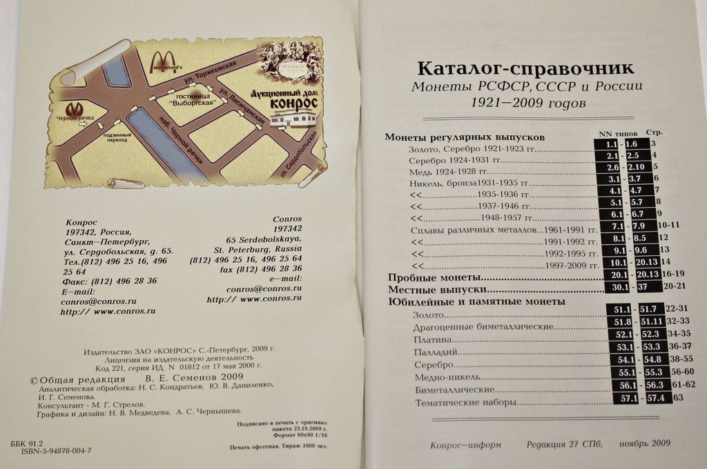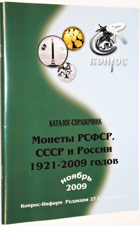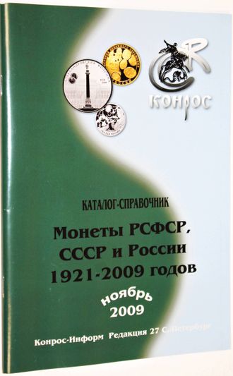Монеты РСФСР,СССР и России 1921-2009 годов. Каталог-справочник. Редакция 27. СПб.: Конрос. 2009. 63с.,ил. Каталог включает в себя монеты регулярных выпусков из драгоценных,медных,никелевых,бронзовых и сплавов различных металлов.Пробные монеты,юбилейные и памятные монеты:из драгоценных металлов,драгоценные биметаллические,из медно-никелевого сплава,биметаллические,тематические наборы.Дает информацию по пробам,весам,тиражам монет.содержит реальные рыночные цены и качественные черно-белые и цветные фотографии. Мягкий переплет. Обычный формат. Отличное состояние.