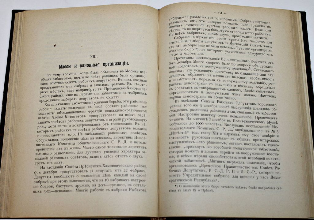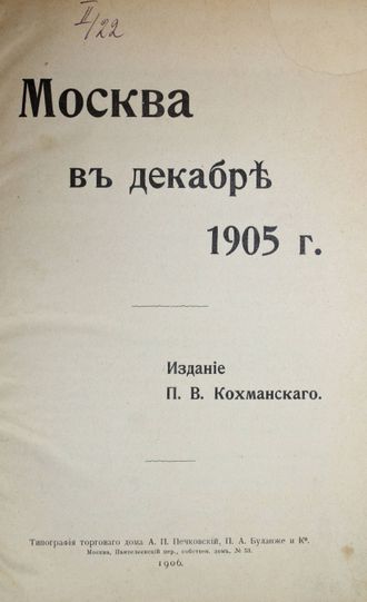 Москва в декабре 1905 г. Издание П.В.Кахманского. М.: Тип. торгового дома А.П.Печковский, П.А.Буланже и К., 1906. – [2], 246 с. Твердый составной переплет. Увеличенный формат, 22.5х15.5 см. Очерки о `декабрьском московском восстании` 1905 года. События описаны как организаторами стачек - членами социал-демократической партии, так и рядовыми свидетелями революции. Переданы подробности забастовок на фабриках, заводах, железных дорогах, организации дружин, санитарных отрядов, данные о способах агитации и числе жертв. Книга содержит постановления организаций, которыми была решена и проведена всеобщая политическая забастовка. Отдельные главы посвящены деятельности Московской городской думы, карательной экспедиции Римана, фактам злоупотребления властей, освещению событий в печати. Хорошее состояние. Реставрация верхнего угла тит. листа.