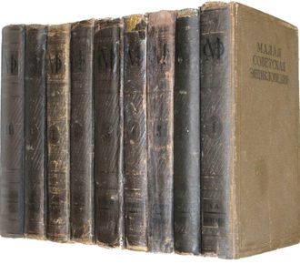 Малая советская энциклопедия в 11 томах. Том 1-8, 11. 2-е издание. М.: ОГИЗ - Малая советская энциклопедия, 1936-1947. Твердый издательский переплет. Энциклопедический формат, 26.5х18 см. 2-е издание было выпущено в 11 томах. В 1936—1941 вышли 10 томов, но из-за начавшейся Великой Отечественной войны оставшийся 11-й том был издан только в 1947 году. Как и у первого издания, тираж составил около 100 тысяч экземпляров, а объём написанного - 790 авторских листов. Удовлетворительное состояние. Потертость переплетов, дефекты корешков отдельных томов, загрязнения.