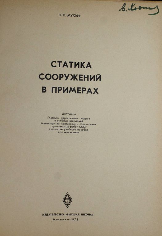 Мухин Н.В. Статика сооружений в примерах. М.: Высшая школа. 1972г. 240с.,ил. Книга содержит краткое изложение основных положений курса `Статика сооружений`, методические указания и подробно разработанные характерные примеры расчета статически определимых и неопределимых стержневых систем и подпорных стоек. Твердый переплет. Энциклопедический формат. Хорошее состояние.
