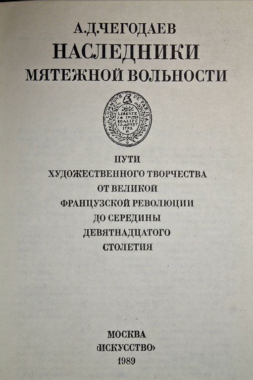 Чегодаев А. Д. Наследники мятежной вольности. Пути художественного творчества от Великой французской революции до середины ХIХ века. М.: Искусство 1989г. 303с. Автор - крупный советский историк искусства - всесторонне и во всем многообразии явлений рассматривает художественную культуру XIX века, сложившуюся под влиянием идей Великой французской революции. В книге раскрывается творчество Гете, Пушкина, Давида и Гойи, Байрона и Констебля, Бетховена и Шопена, Гоголя и Александра Иванова и других выдающихся творцов в главных своих чертах, во всем многообразии и единстве. Богатейший материал истории художественного творчества позволит читателю увидеть сложную и увлекательную картину развития искусства этого периода. Твердый переплет. Увеличенный формат. Отличное состояние.
